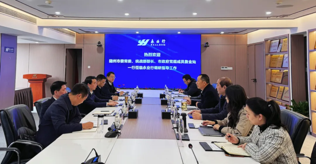 2025年3月29日,随州市委常委、统战部部长、市政府党组成员詹金灿,市政府副秘书长周世学,市住房和城市更新局局长刘海一行莅临永业行,就城市更新工作开展座谈交流。永业行党委书记、董事长潘世炳,常务副总裁吴学锋,高级副总裁文云波等热情接待并参加座谈会议。